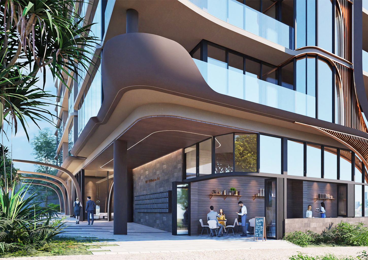 This 10 storey apartment building makes the most of it’s premium East Brisbane location overlooking Raymond Park, and providing city, river, and mountain views. The development features a connection for future laneway thoroughfare, rooftop residents facilities, and retail or café adjacent the street. The design takes inspiration from surrounding flora (particularly the flower and seed pods of the banksii plant) and subtly integrates this into the façade.